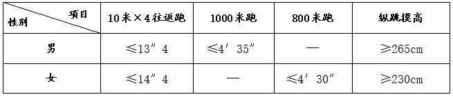 执行法警岗位增加体能测评环节,根据考试总成绩,由高分到低分按1:3的比例确定入围体能测评人选(测评项目及标准见下表)。体能测评为达标性测试,成绩不计入考试总成绩,凡其中一项不达标的,视为体能测评不合格,不能确定为体检考察人选。