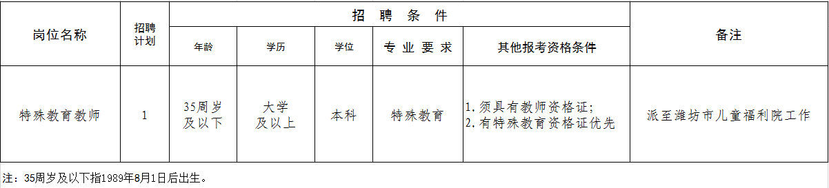 原标题:潍坊高新人力派驻某医院项目工作人员招聘公告(特教岗)