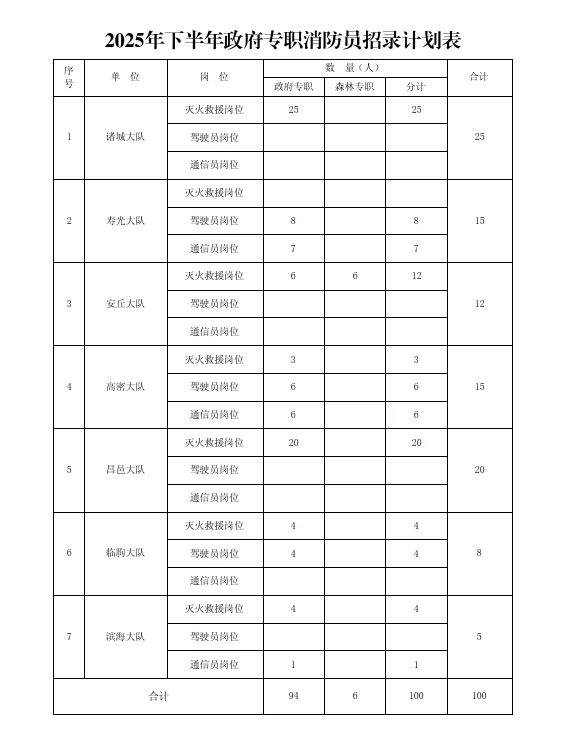 森林专职消防员:全市共计划招收灭火救援岗位森林专职消防员6人。招录数量及岗位设置请参照潍坊市消防救援支队招录计划表